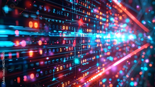 Glowing Neon Binary Code Data Visualization in High-Tech Digital Processing