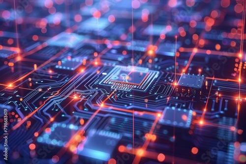 Glowing neon blue and red circuits illustrating powerful computing processes and high-speed data transmission