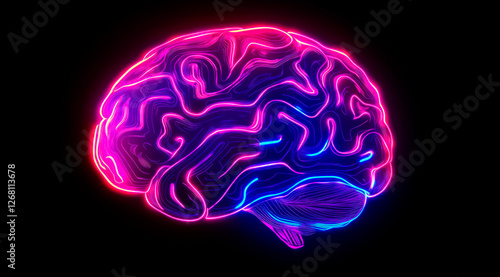 Glowing neon brain design showcasing circuit patterns as a representation of artificial intelligence and technology against a deep black backdrop