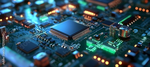 Glowing Neon Circuit Board with Microchips and Integrated Components