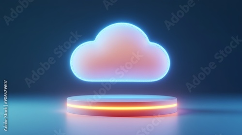 Glowing neon cloud hovering over a futuristic platform, symbolizing technology, innovation, and cloud computing in a modern digital concept.