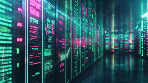 Glowing Neon Digital Screens In A Data Center