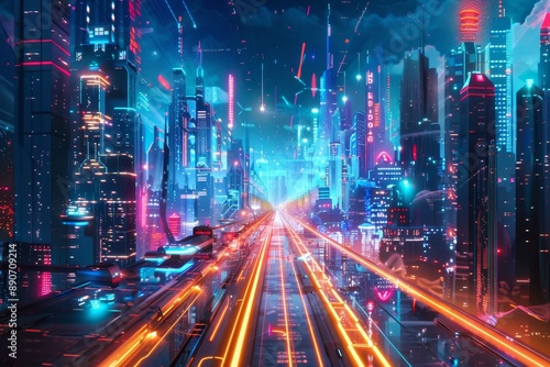 Glowing neon lights illuminating a futuristic cyberpunk cityscape for a dystopian future theme