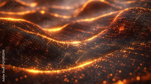 Glowing orange and gold particles forming dynamic waves, abstract background
