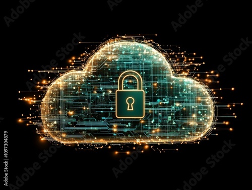 Glowing orange and green cloud icon with a secure padlock, integrated into a dynamic particle network, symbolizing secure cloud storage, data encryption, and cybersecurity