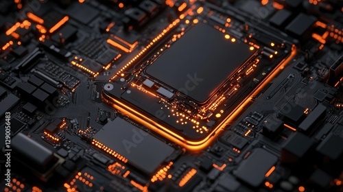 Glowing Orange Circuit Board with Central Microchip in Focus