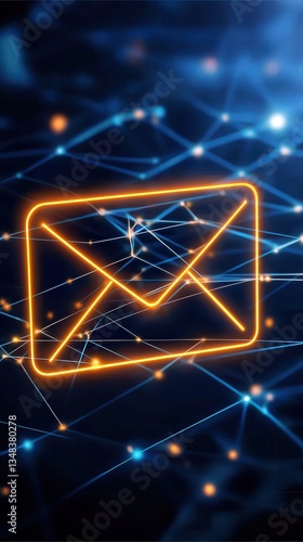 Glowing Orange Email Icon Floating Above Abstract Network of Interconnected Blue Lines and Nodes Illustrating Digital Communication Concept
