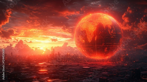 Glowing Orb Hovers Over Futuristic Cityscape at Sunset