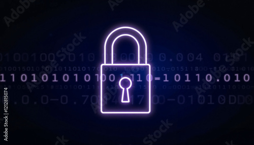 Glowing padlock icon on digital screen with binary code, cybersecurity concept