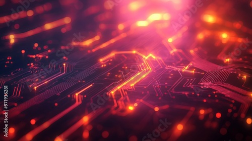 Glowing Red Circuit Board with Blurry Background