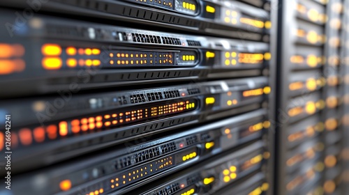 Glowing server rack displays vibrant data flow intensely. AI Generated