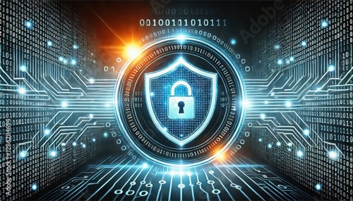 Glowing Shield Icon Surrounded by Binary Codes Representing Cybersecurity.