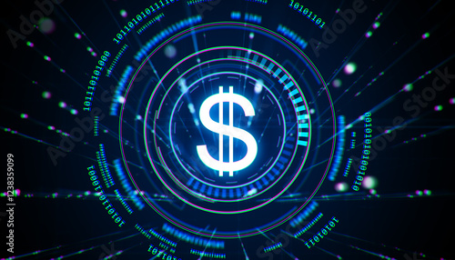 Glowing USD Dollar Symbol with Binary Code on Futuristic Digital Background. 3D Rendering