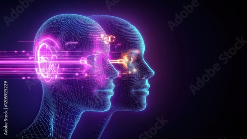 Glowing wireframe heads with digital streams of light, representing artificial intelligence, deep fake technology, and neural networks.