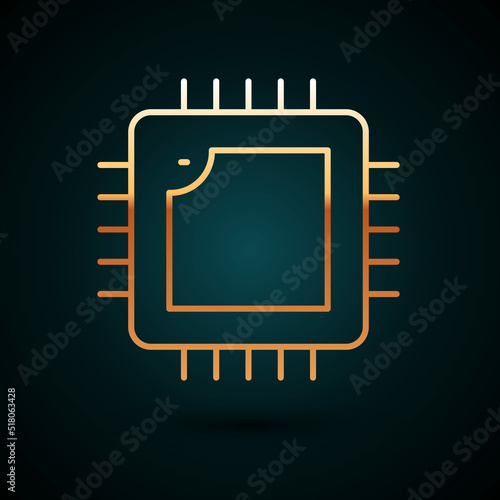 Gold line Computer processor with microcircuits CPU icon isolated on dark blue background. Chip or cpu with circuit board. Micro processor. Vector