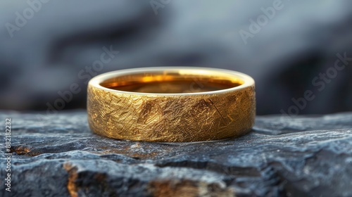 gold wedding ring sitting on a rock