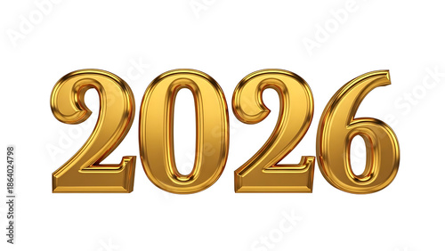 Golden 2026 Numbers, Shiny 3D Year Text, Isolated on White Background