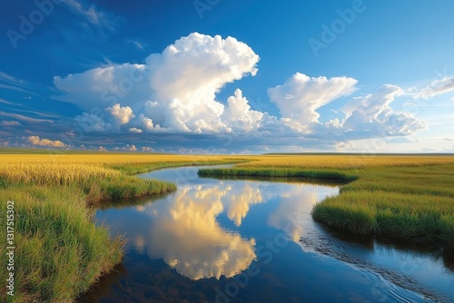 Golden clouds fluffy clouds reflections beauty. Serene landscape with a river reflecting clouds and grassy fields.