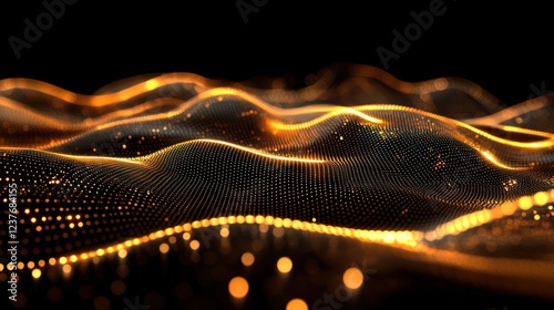 Golden data wave flowing, dark background, digital art, tech use