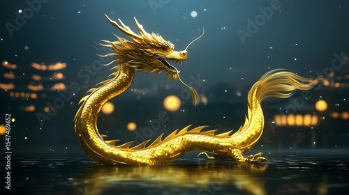 Golden Dragon in Night City, chinese dragon, mythical creature, fantasy, cityscape, lights