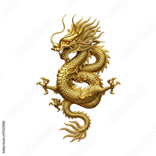 Golden Dragon Sculpture, isolated on white or transparent background. PNG