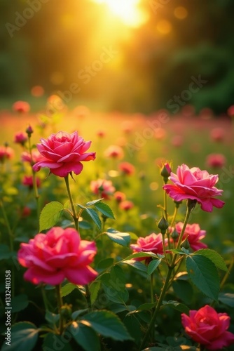 Golden sunlight bathes vibrant wild roses in a lush meadow , shrub, nature