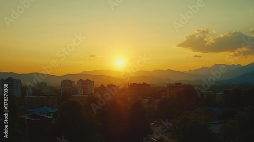 Golden sunset over city skyline, mountains backdrop, aerial view