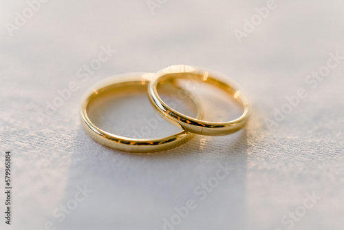 Goldene Eheringe in wunderschönem Licht bei Hochzeit