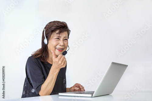 白背景でヘッドセットを付けノートパソコンを前にGoodサインをするシニア女性