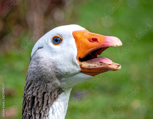 Goose head close-up, open beak