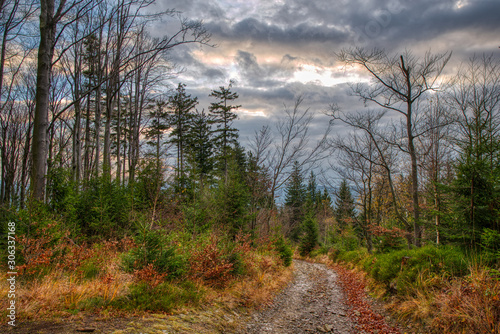 Gorgeous road from mountain with beech trees around in autumn