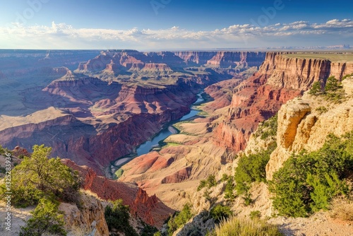 Grand Canyon vista, high viewpoint, sunlit river, distant clouds