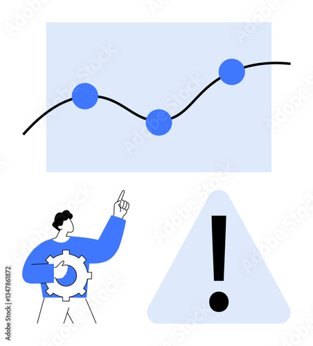 Graph with rising dots, triangular alert symbol, and person holding gear gesturing solution. Ideal for growth analysis, risk, decision-making, problem-solving, strategy, innovation flat simple