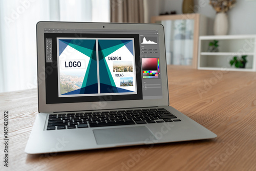 Graphic designer software for modern design of web page and commercial ads showing on the computer screen
