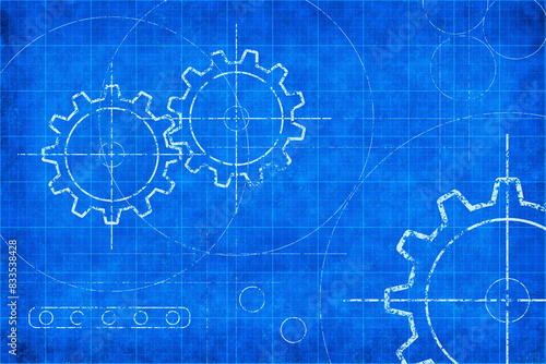 Graphic illustration of cogs on old blueprint paper. Use as layer or design element for web, print or other graphics.