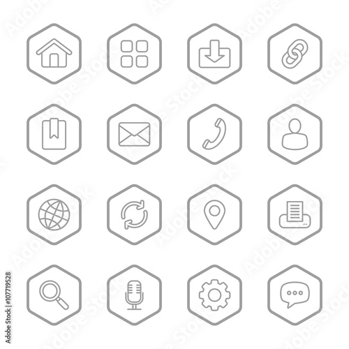 gray line web icon set with hexagon frame for web design, user interface (UI), infographic and mobile application (apps)