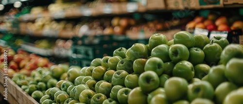 green apples pile on a market stand, realistic and shinny