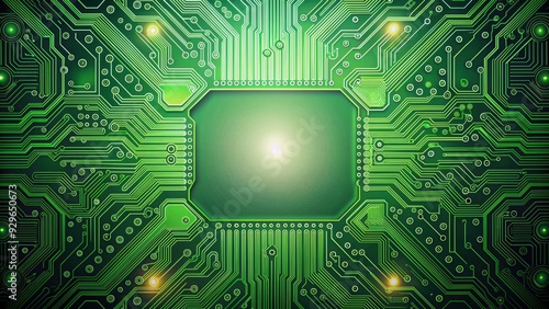 Green backdrop with integrated circuit board, technology, electronics, computer chip, hardware, innovation, connection