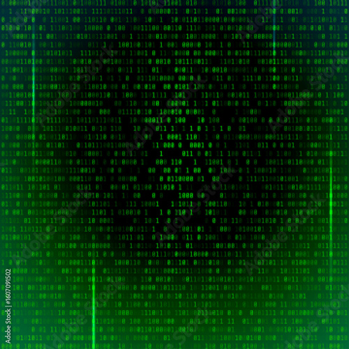 Green binary code forms an abstract digital pattern, illustrating a futuristic data matrix background with a technological design