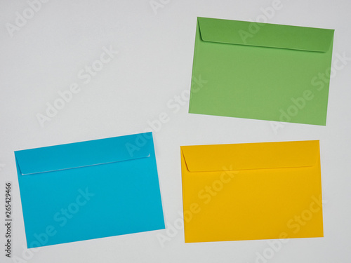 Green, blue, yellow envelopes on a white background