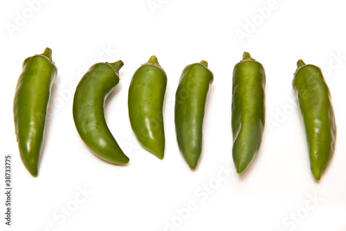 Green chilli peppers isolated on a white studio background.