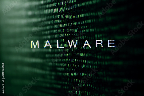 Green digital code background with the word MALWARE displayed prominently, symbolizing cybersecurity threats and digital risks