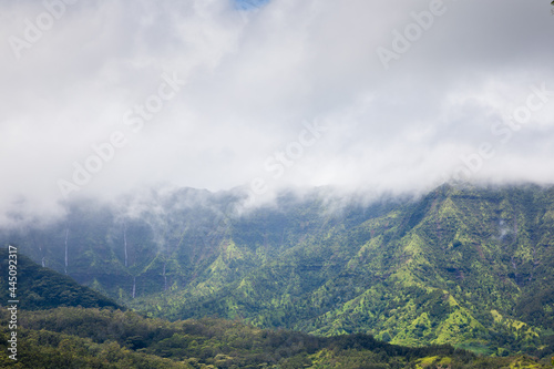 Green hills, waterfalls and mist at Halelea Forest Reserve, Kauai, Hawaii