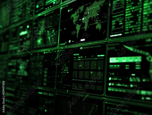 Green illuminated data screens displaying global analytics and cyber information, emphasizing technology and network security.