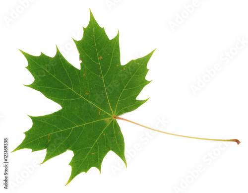 Green maple leaf on white background
