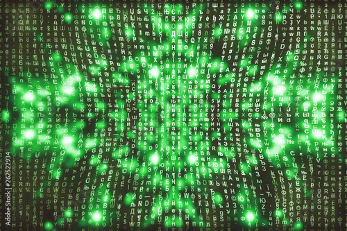 Green matrix digital background. Abstract cyberspace concept. Characters fall down. Matrix from symbols stream. Virtual reality design. Complex algorithm data hacking. Green digital sparks.