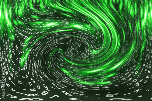 Green matrix digital background. Distorted cyberspace concept. Characters fall down in wormhole. Hacked matrix. Virtual reality design. Complex algorithm data hacking. Green digital sparks.
