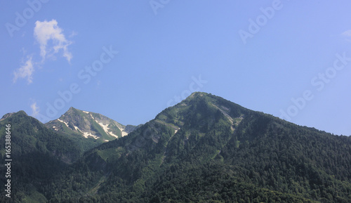 Green mountain tops against a blue sky.