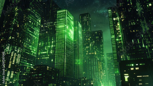 Green Neon Cityscape Under Rain