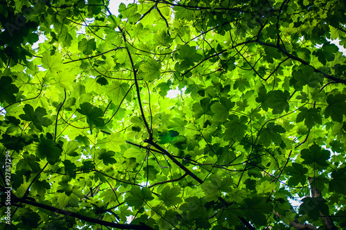 Green summer leaf looking up in a forest.